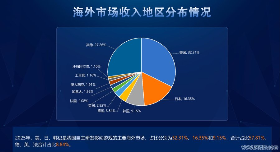 其中,自研挪动游戏国际商场骨子销售收入184.78亿好意思元,同比增长13.16%。在人人经济波动、竞争显著加重配景下,我国游戏企业积极支吾,展现出不俗实力和强盛韧性。本年,好意思、日、韩还是我国自主研发挪动游戏主要国际商场,占比辞别为32.31%、16.35%和9.15%,料想打算占比57.81%。德、英、法料想打算占比8.84%。不论好意思、欧、东亚等熟练商场,照旧拉好意思、中东等新兴商场,合座散播状貌暂无显著变化。国际商场收入前100的自研挪动游戏中,策略类(含SLG)占比49.96%,同比显赫飞腾,仍居首位;射击和变装演出类,辞别占比9.69%和9.39%。在近五年的名次中,策略类一直保捏着国际营收主力地位。